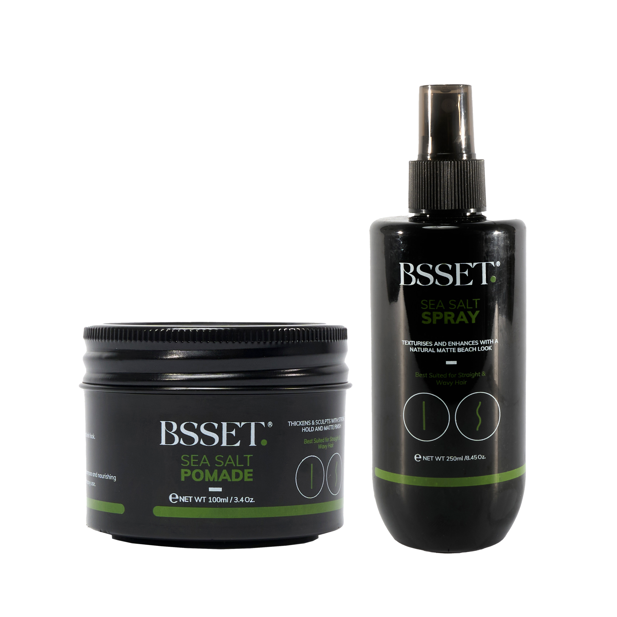 Create effortlessly textured hairstyles with the BSSET Sea Salt Pomade and Spray duo. Ideal for adding volume and a matte finish, this combination enhances natural waves and provides a flexible hold. Spritz the Sea Salt Spray onto damp hair to add texture and body, then work in the Sea Salt Pomade to sculpt and define your style. Achieve a natural, beachy look with ease.