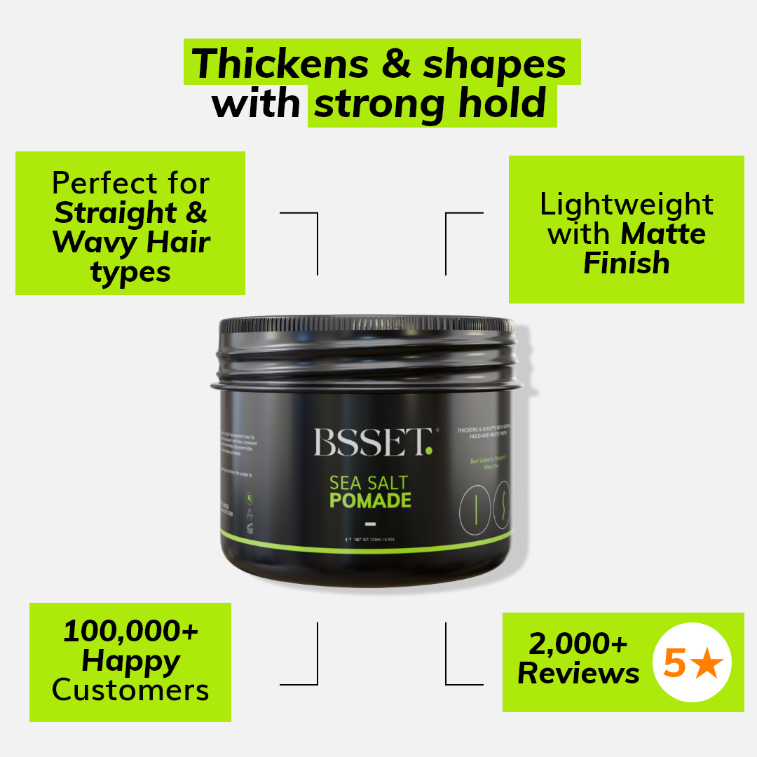 Thickens, sculpts, and delivers a strong hold with a matte finish, perfect for creating textured and defined styles. Ideal for straight or wavy hair (type 1 or type 2), this pomade offers versatility for both messy, tousled looks and sleek, polished styles. Use it with the BSSET Sea Salt Spray, Hair Styling Powder, or both for added volume and grip—or enjoy its benefits as a stand-alone styling product.